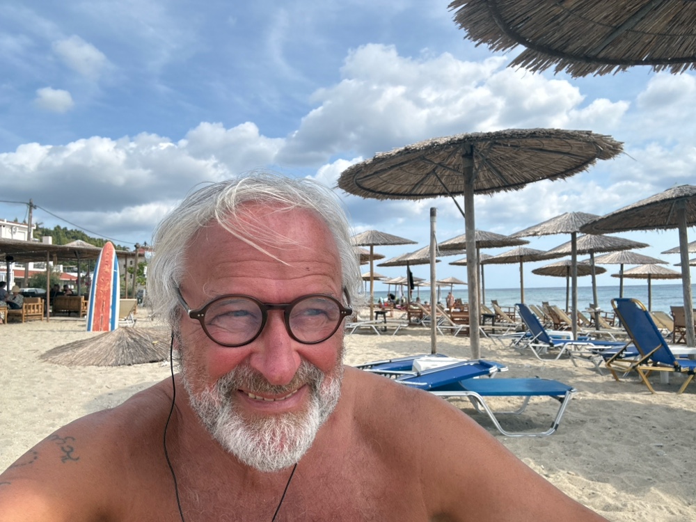 Das Wetter wird schlechter. Es ist kalt ( 18 Grad) und windig. Es soll bald regnen. Wir haben überlegt, nach Thessaloniki zu fahren, uns dann aber doch noch mal für den Strand entschieden. Die Fahrt nach Nea Skioni ist auch ganz schön. Anfangs war es uch noch etwas ungemütlich, aber dann kam doch noch die Sonne raus und wir blieben lange dort. Leider musste ich entdecken, dass,meine Sandalen (die einzigen Schuhe, die ich dabeihabe) kaputt sind. Ein Riemen (ein wichtiger) ist gerissen. In unserem Appartement habe ich ihn dann genäht, aber bei dem sehr dünnen Garn, das ich dabei habe, hält das nicht lange. Hier gibt es auch nur einfache Latschen (Addiletten) in Größe 40/41. Also: vorsichtig gehen!
